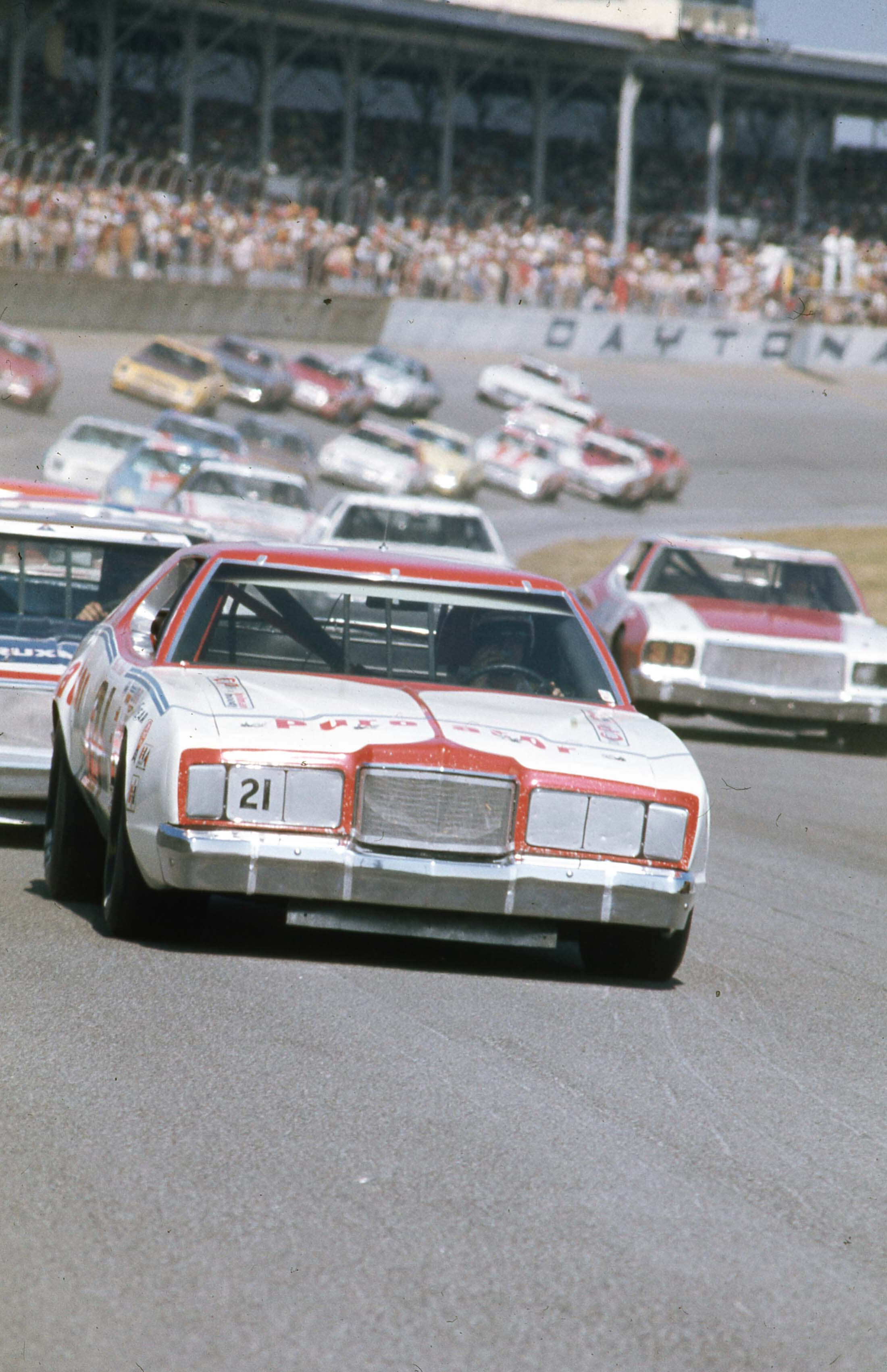David Pearson (No. 21) came to Daytona in search of his first victory in the Great American Race. NASCAR Hall of Fame Permanent Collection, gift of R.J. Reynolds Tobacco Company