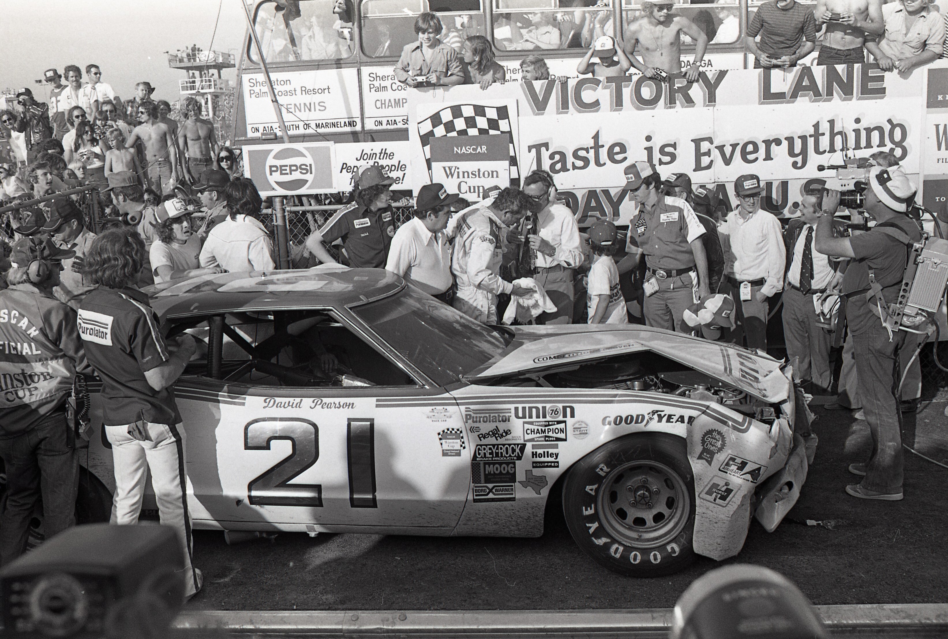 After the crash, Petty’s Dodge stalled, while Pearson pushed in the clutch on his Mercury and took the car out of gear, keeping the motor running. Despite heavy damage to his car, Pearson was able to put the car back into gear and limp across the finish line as Petty sat helplessly in his wounded car just 100 yards or so from the start-finish line.