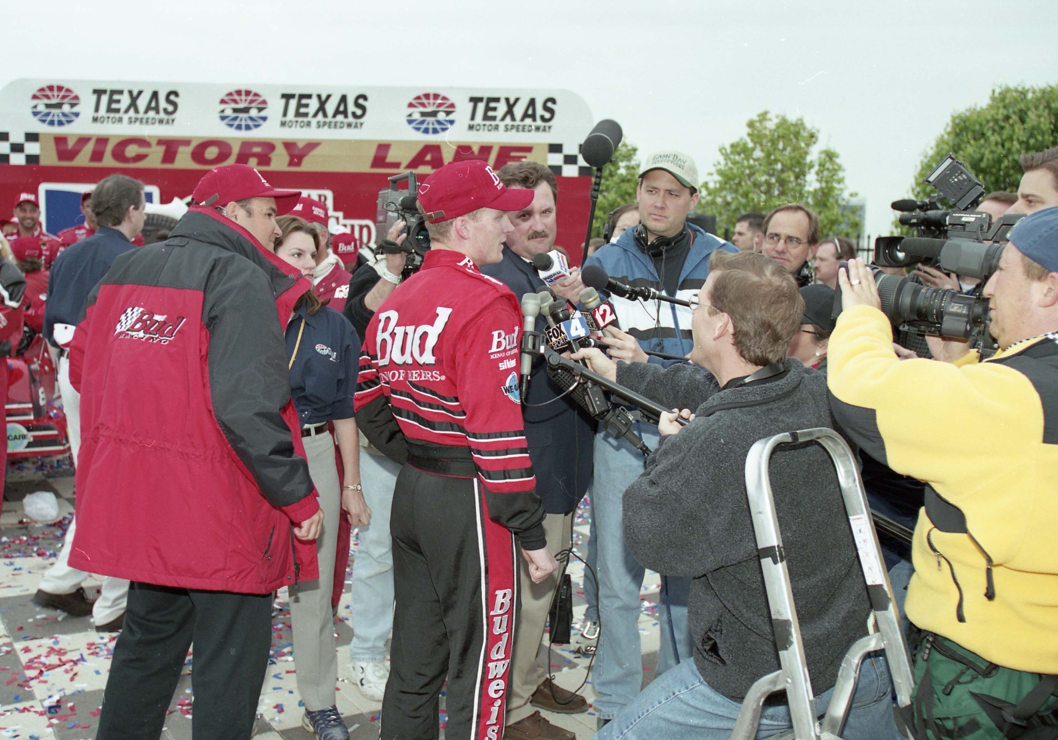 After his win at Texas Motor Speedway, Dale Earnhardt Jr. gave post-race media interviews from Victory Lane. NASCAR Hall of Fame Collection, gift of R.J. Reynolds Tobacco Company
